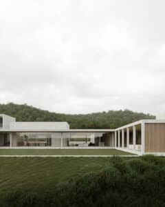 Materially, the house is defined by enduring, robust elements. Pale masonry and concrete form a solid external envelope, paired with a restrained roof form that reinforces the building’s clarity and permanence. Internally, natural timber linings, stone, and concrete introduce warmth and texture, creating a calm and tactile interior environment.