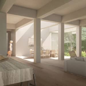 Designed for a couple with two young children, the expansive house includes three bedrooms at ground level, together with a separate lounge/rumpus room. The main bedroom suite, with its generous walk-in-dressing area and ensuite forms part of this arrangement. And to ensure this is a ‘forever house’, there will be a lift as well as stairs. And on the first floor with impressive views of Melbourne’s skyline, are the open plan kitchen, dining and living areas that lead to a generous terrace with a canopy to protect it from the western aspect.